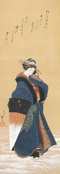作品は戦前に重要美術品にも指定された「雪中美人図」。 縦 1 メートル近い画面に、雪降るなか吉原の花魁とみられる女性がたたずむ姿を描いている。 鮮やかな青が印象的で、文化・文政期の 1813 - 19 年の北斎円熟期の秀作とされる。 当初の落札予想額は 4 千 ‐ 6 千万円だった。 慶応大の内藤正人教授(日本美術史)は「『北斎』の後、『戴斗(たいと)』を名乗った時期で、妖艶きわまりない代表作の一つ。 重要文化財クラスの名品ではないか。」と話している。 (編集委員・大西若人、asahi = 11-10-25)