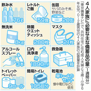 災害時にエレベーターが止まった場合、荷物を持って階段を上り下りするのは難しい。 各地で一斉に止まれば点検に時間がかかり、復旧に 1 週間以上かかるケースも想定される。そのため高層階に住む住民ほど、食料や日用品などの備蓄が大事になってくるという。 都はインターネットサイト「東京備蓄ナビ」で、家族の人数や年齢、住まいの種類を入力すると必要な備蓄品や量が分かる情報を提供している。 1 戸建ての 3 日分に対し、マンションなどの共同住宅は 1 週間分が目安。 共同住宅に住む 4 人家族で計算すると、飲み水 76 リットルなど 58 品目ものリストが示された。