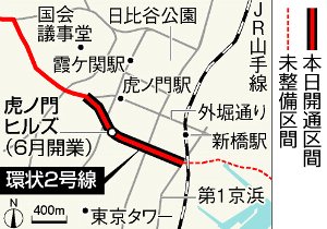 東京都心の新たな大動脈となる都道・環状 2 号線新橋 - 虎ノ門間(1.4 キロ)が 29 日、開通した。 トンネルで大量の車をさばく一方、地上部には最大幅 13 メートルの歩道にオープンカフェが立ち並び、歩いて楽しい街にするのが都の計画だ。 2020 年東京五輪の主会場を結ぶ重要路線にもなる。