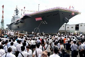 【其山史晃】 海上自衛隊の艦艇で最大となるヘリコプター搭載型護衛艦(全長 248 メートル、基準排水量約 1 万 9,500 トン)の命名・進水式が 6 日、横浜市磯子区の「ジャパン マリンユナイテッド」の横浜工場であった。 島根県東部の旧国名にちなんで「いずも」と名付けられた。 就役は 2015 年 3 月ごろの予定だ。