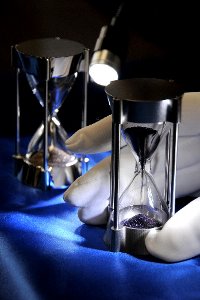 自動車エンジンの燃料噴射装置の部品などを造る小松精機工作所の製造部長、小松隆史さん (42) は、プレス機でステンレス材に髪の毛ほどの細い穴を開けた際に押し出される直径 100 ミクロンの円柱の棒を細かく切断した金属粉体の利用法を探っていた。 メンバーらと話す中で「砂状なら砂時計だろう」となり、開発がスタートした。 (asahi = 8-4-13)